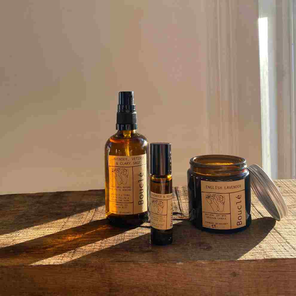 1x All-natural Bouclé candle in scents like Rosemary, Lavender & Clary Sage or English Lavender 1 x 100ml Exclusive Bouclé Pillow Spray with 100% pure essential oils in blends like Lavender, Vetiver & Clary Sage or Chamomile, Lavender & Frankincense 1 x 10ml Lavender & Rosemary Essential Oil Pulse Point Roller