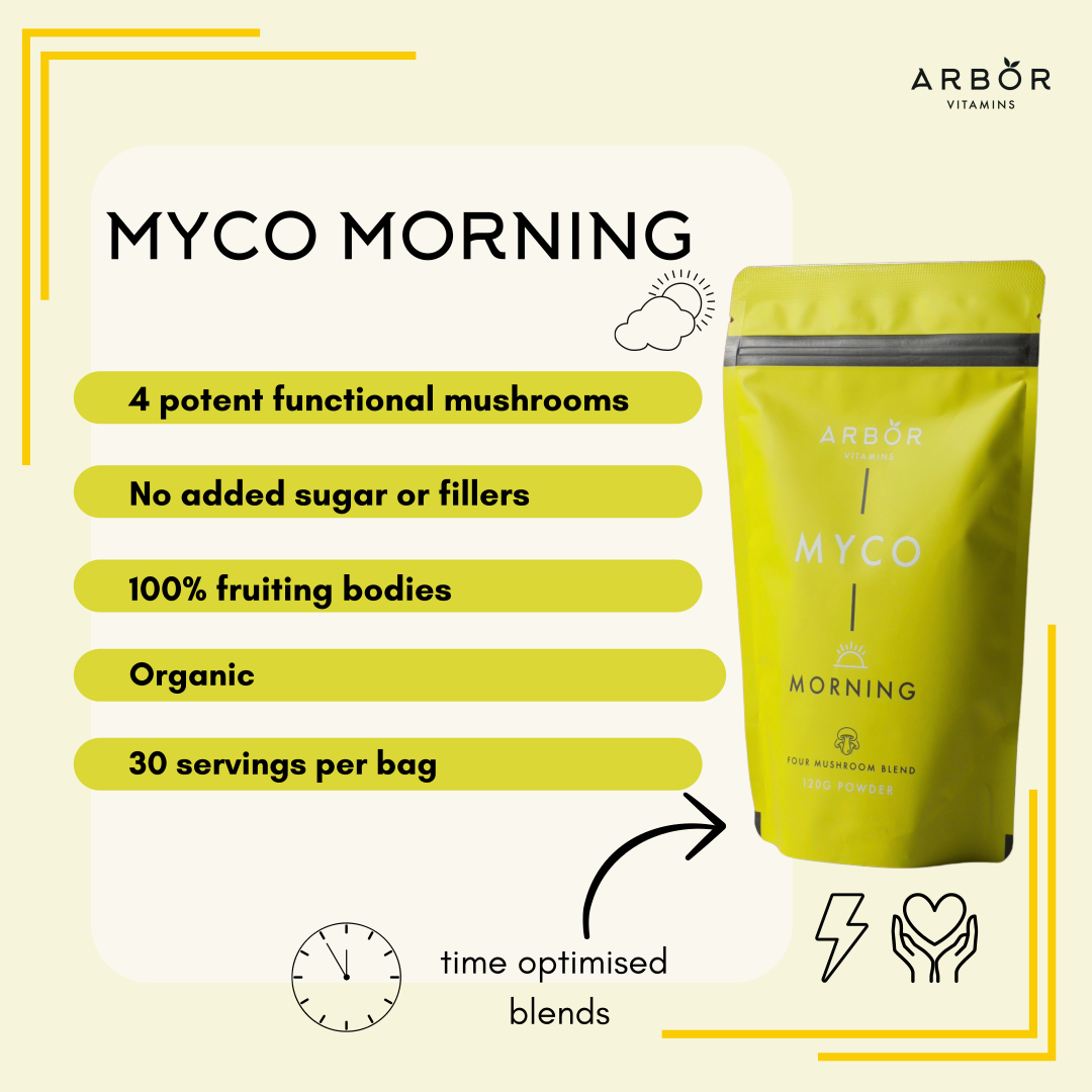 MYCO Morning - 4 mushroom blend of Lion’s Mane, Cordyceps, Chaga, and Shiitake. Designed to boost energy levels, offer cognitive support , fortify your immunity and help to reduce bodily inflammation. Add MYCO Morning to your morning routine for a natural boost to your day.
