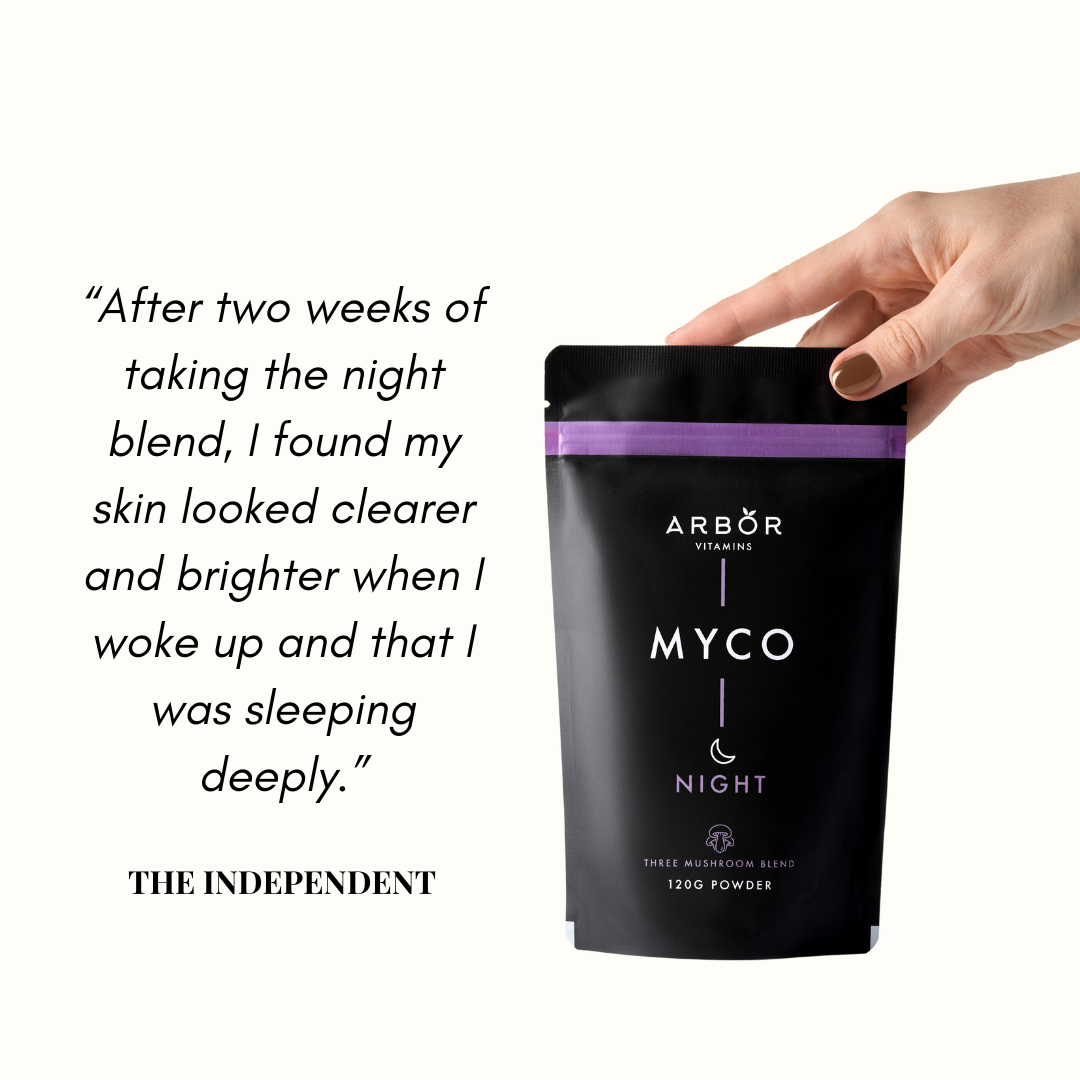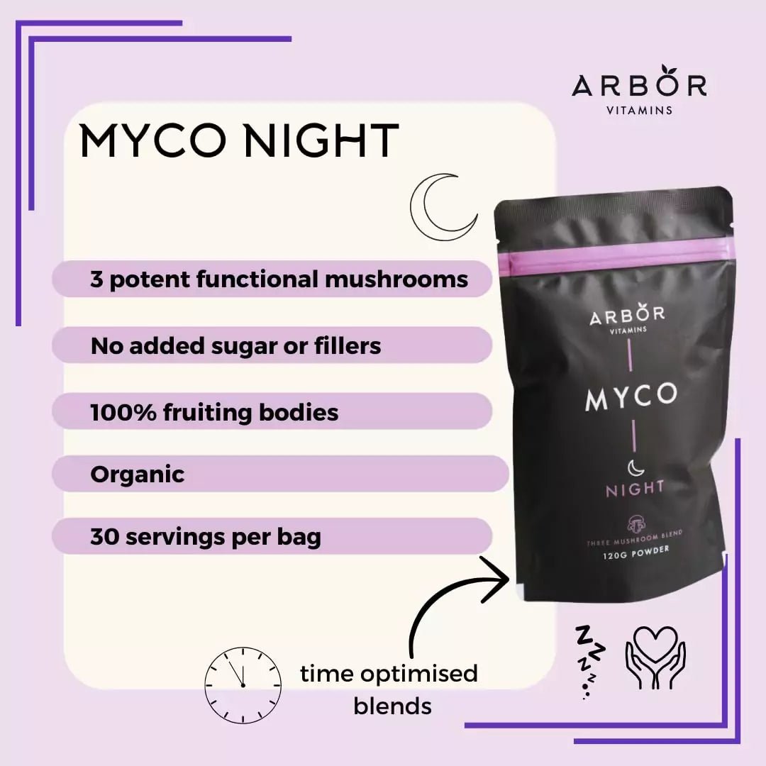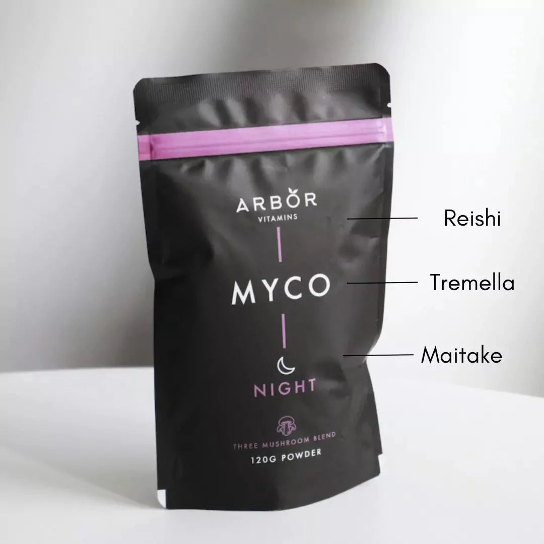 MYCO Night - 3 mushroom evening blend of Reishi, Maitake, and Tremella mushrooms. This night-time blend is formulated to help reduce stress, support immunity and a healthy complexion. Reishi is known for its calming effect on the body and mind, Maitake supports body equilibrium, and Tremella is known for its antioxidant properties which may improve skin health.